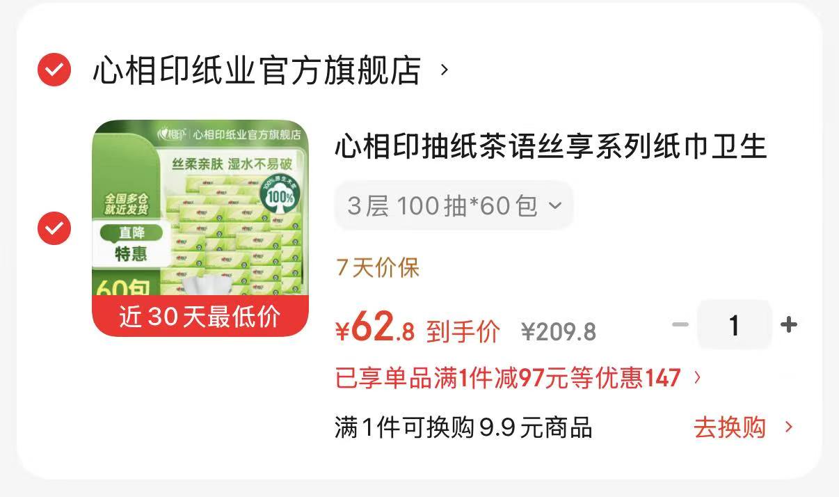 62.8🉐茶语抽纸60包!3层*100抽/包!