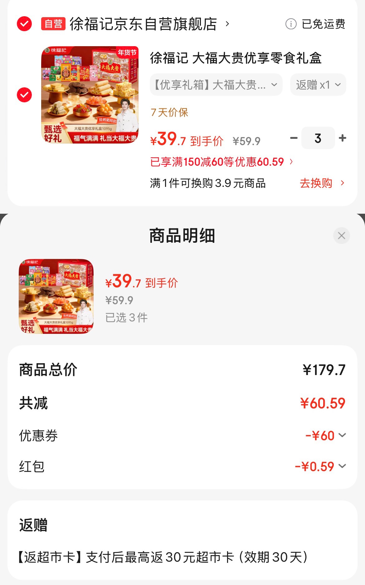 付款119.7,返30超市卡,实际到手89.7