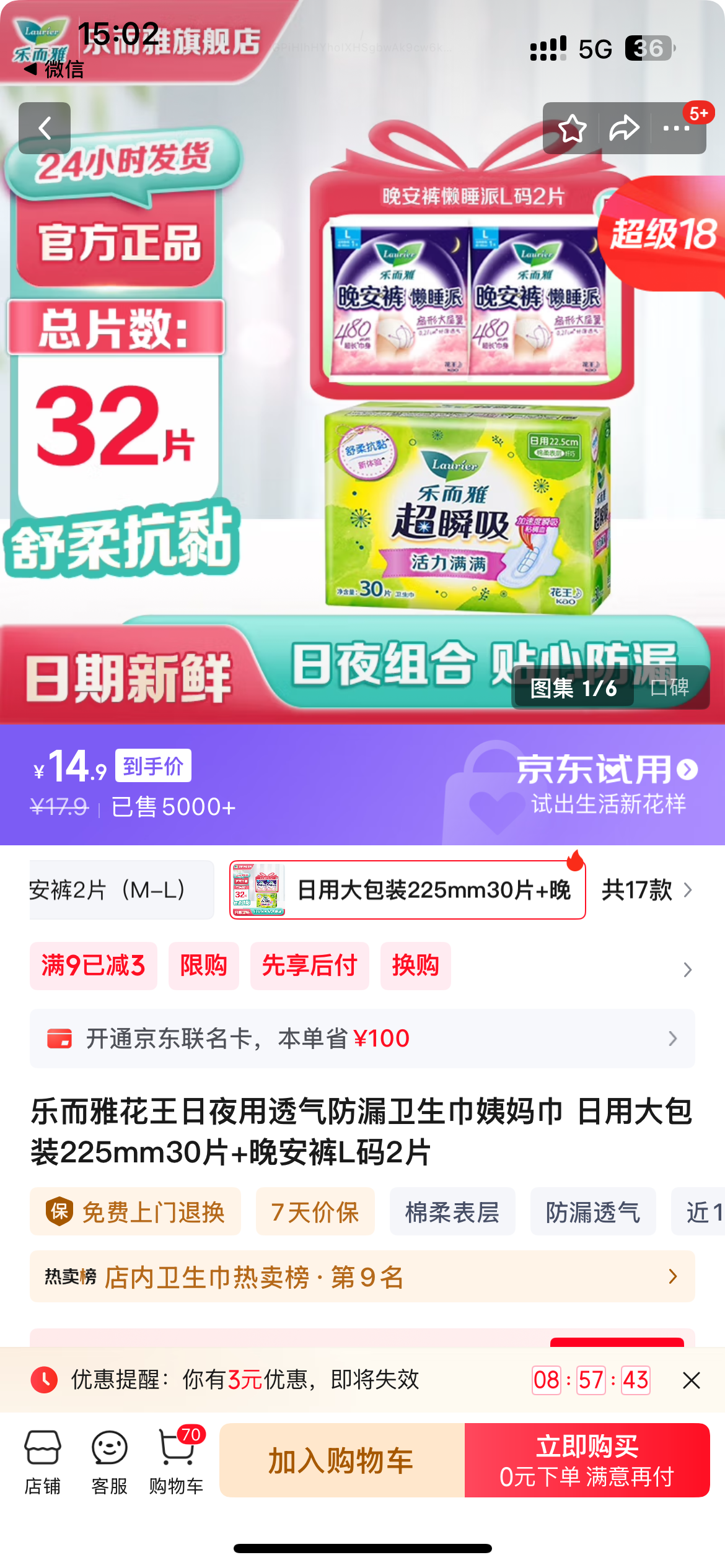 14.9💰到手30片日用225mm!没有护垫凑单!限时赠🎁安睡裤两条!总共到手32片!